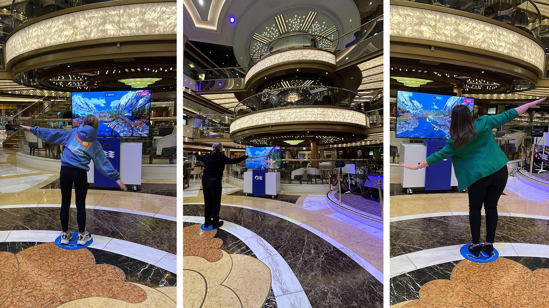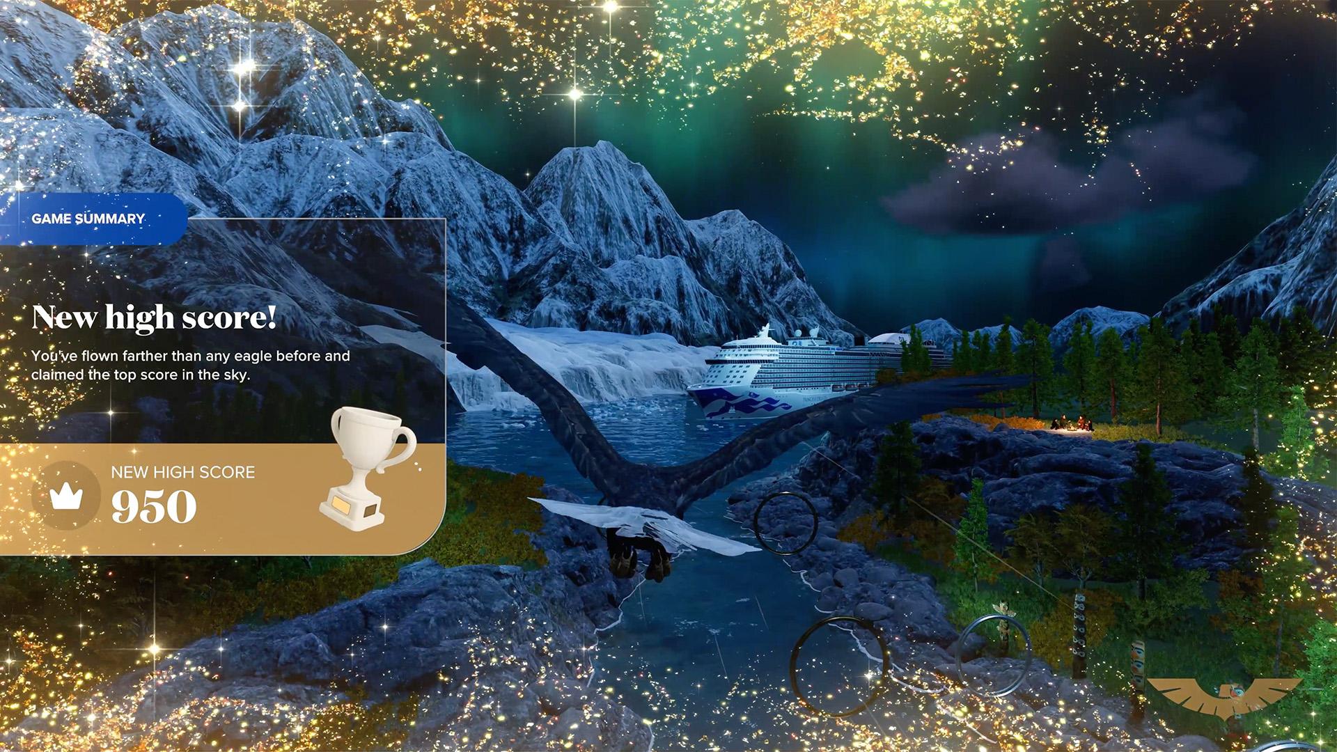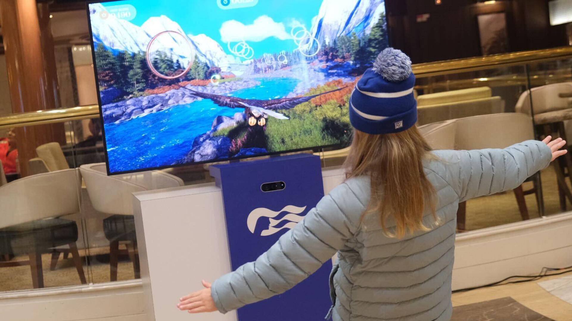Princess Cruises and Groove Jones collaboratively introduced Eagle Quest Alaska. This immersive, controller-free flight simulation experience transports guests into the majestic skies of Southeast Alaska aboard multiple cruise ships. Powered by computer vision and full body motion tracking, this experience invites travelers of all ages to embody a bald eagle—flapping, tilting, and diving with only their own body movements, with absolutely no physical controllers required .