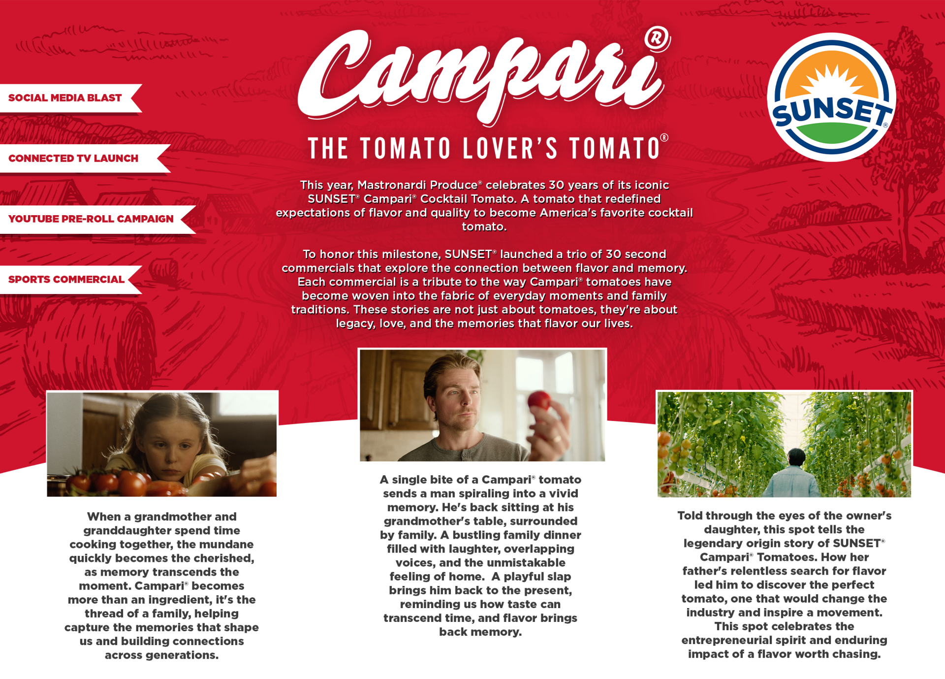 This year, Mastronardi Produce® celebrates 30 years of its iconic SUNSET® Campari® Cocktail Tomato. A tomato that redefined expectations of flavor and quality to become America's favorite cocktail tomato. To honor this milestone, SUNSET® launched a trio of 30 second commercials that explore the connection between flavor and memory. Each commercial is a tribute to the way Campari® tomatoes have become woven into the fabric of everyday moments and family traditions. These stories are not just about tomatoes, they're about legacy, love, and the memories that flavor our lives.