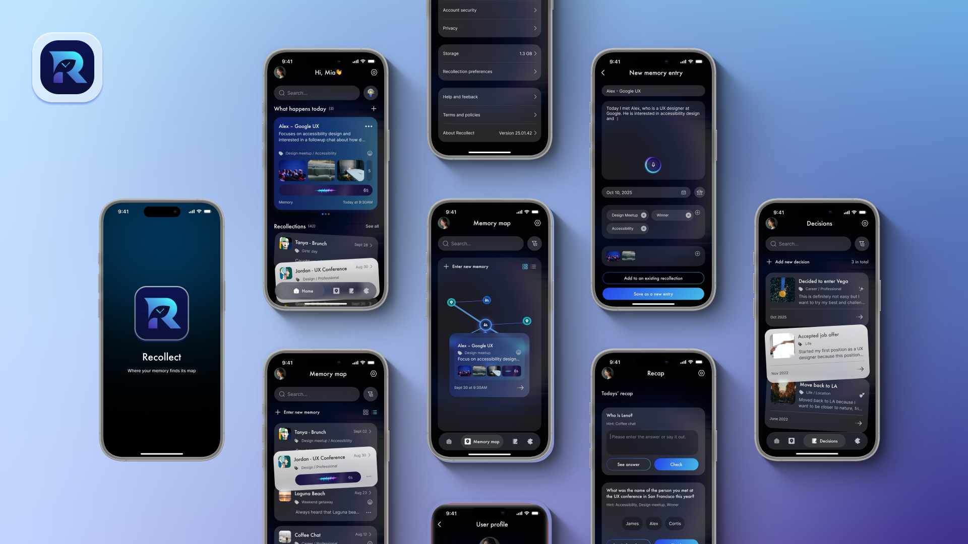 Recollect is a memory-mapping app designed to help people remember with intention. It began with a clear problem: modern tools capture information endlessly but rarely help users retrieve meaning from it. Notes, images, and reminders pile up, while the emotional context that gives them value disappears. Recollect reverses this pattern. Instead of focusing on storage, it focuses on understanding—turning reflection into an active, structured experience. The design stems from research into how people recall personal and professional events. Interviews and diary studies showed that users remembered why something mattered more than what happened. They also revealed that long-form journaling often fails because it demands too much effort and provides little feedback. From this insight came the app’s central idea: record less, remember better. Recollect encourages short, intentional entries called “memory cards.” Each card holds a brief note, emotion tag, and optional image or link. Over time, these entries form relationships rather than lists. The system maps them visually, showing connections between themes, people, and moods. An adaptive reinforcement feature resurfaces past memories based on recency and emotional weight, reminding users of patterns before they fade. This transforms memory management into a form of guided awareness rather than data retrieval. The visual language reflects that same restraint. A gradient of dark to light blue (#2546EA → #43B9E7) represents privacy, time and calm continuity. The typography pairing, Futura for headings and Inter for body text, balances geometric precision with digital readability. The overall interface remains minimal and reflective, allowing the content of memory to stand out instead of competing with design. Recollect is both a cognitive and emotional tool. It reduces friction in capturing moments and builds insight through connection. For professionals, it clarifies progress and recurring challenges. For individuals, it preserves the logic of experience, essentially, how emotions and choices evolve over time. By blending structured memory science with human reflection, Recollect turns remembering into an intentional act of design.
