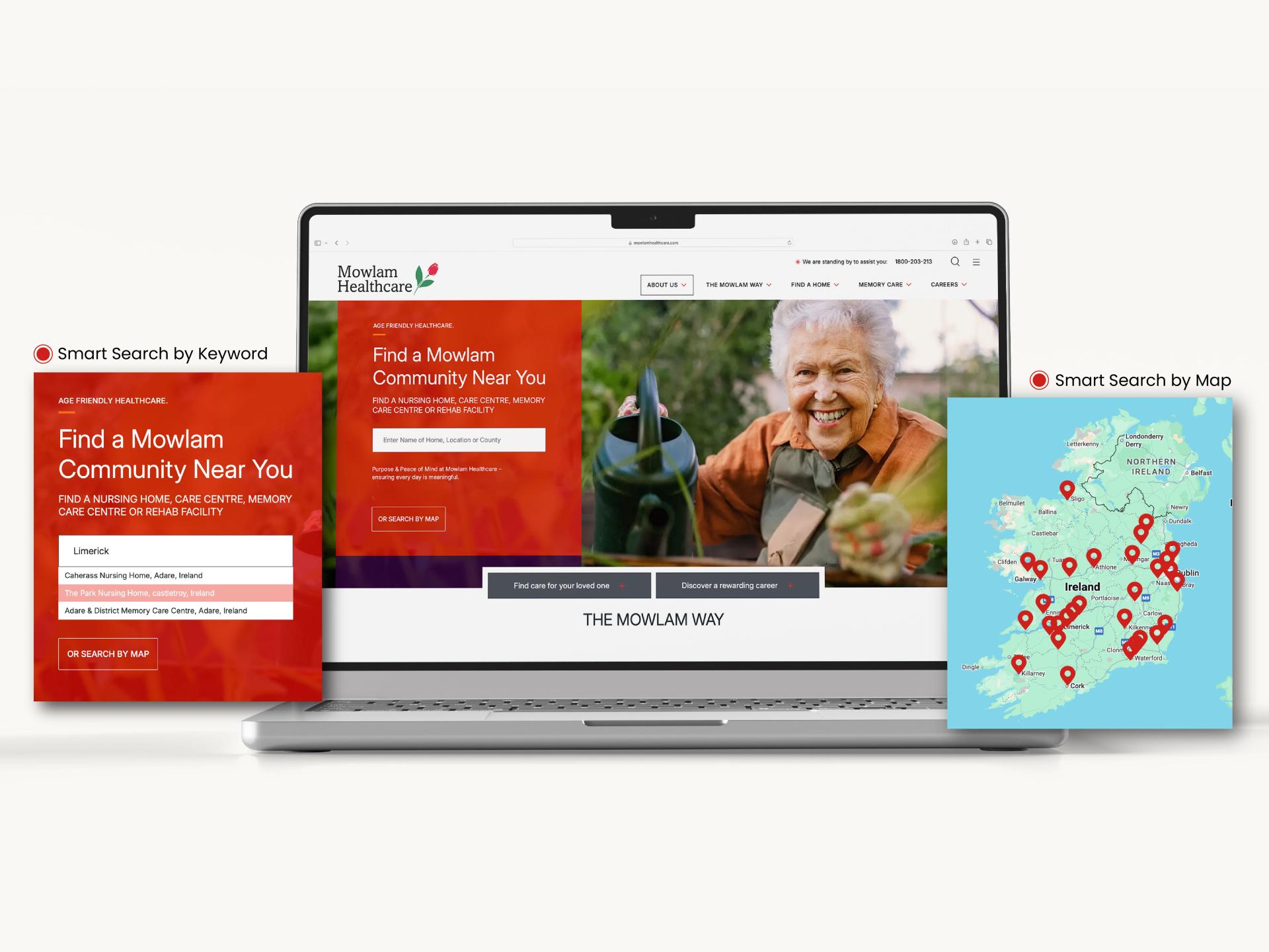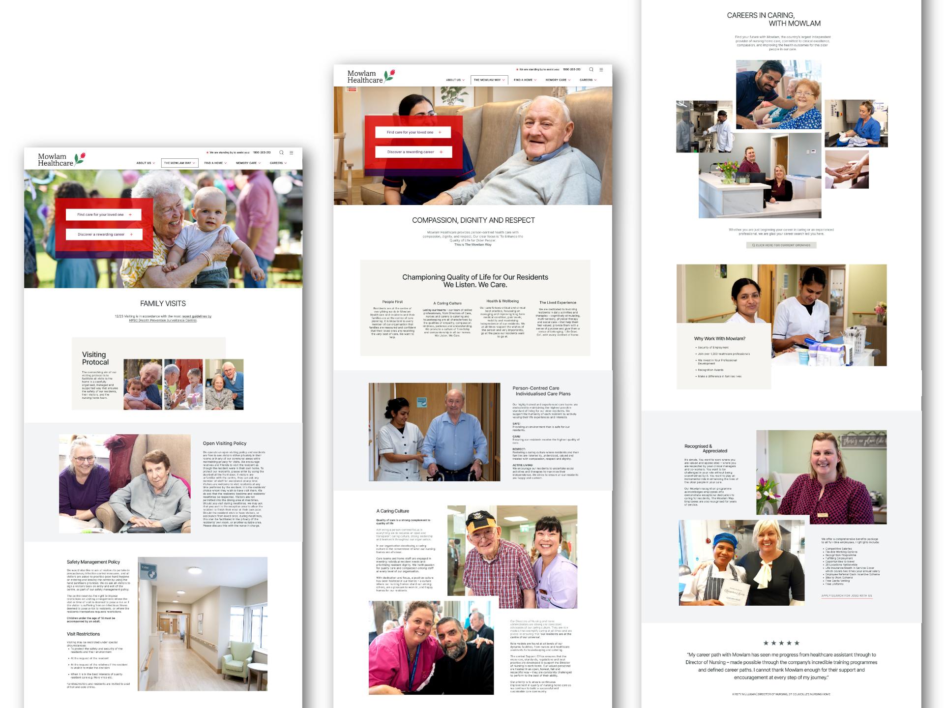 A warm, compassionate visual style was crafted using authentic photography from across Mowlam’s 27 nursing homes, paired with soft colour palettes and confident, reassuring messaging. We introduced interactive maps, intelligent search tools, step-by-step care explanations, and improved pathways for resident families.