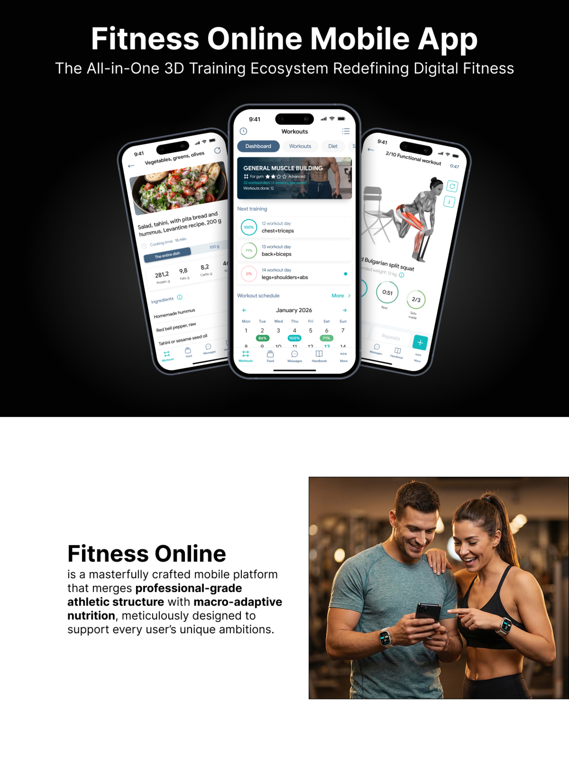 Fitness Online is a comprehensive mobile platform for training and nutrition, designed for those seeking professional-grade structure tailored to individual goals. The app distills complex performance metrics into intuitive, actionable insights through a sophisticated visual interface for every skill level. Visual Excellence & Execution Quality A minimalist design system reduces cognitive load during workouts and keeps attention on the next step. The platform includes 850+ exercises supported by precise muscle visualizations, helping users quickly understand form and movement patterns. By prioritizing 3D visual instruction over standard video, technical concepts become easier to learn and more consistent to follow. Untethered Innovation: Apple Watch Fitness Online extends core workout management to Apple Watch with a standalone architecture that lets users log sets, adjust exercises, and track progress directly from the wrist (phone-free). This reduces device switching and supports uninterrupted training when hands-free interaction is preferred. Structural Clarity at Scale Despite its vast All-in-One ecosystem - 10,000+ localized recipes, macro-adaptive nutrition tracking, comprehensive educational content-navigation remains remarkably intuitive. The Social Sports Feed and integrated chat foster community engagement through clean, social-media-inspired layouts that avoid clutter while maintaining functional depth. Data as Visual Storytelling Smart analytics transform raw metrics into elegant visual narratives. Active muscle distribution, load progression, and heart rate zones are rendered through minimalist charts designed for at-a-glance comprehension. Each visualization turns complex performance data into a compelling, motivating record of progress. Nutritionist-Designed Integration Developed by certified nutritionists, the meal generator creates science-backed, personalized plans using accessible ingredients. Instant meal swaps, seamless macro tracking, and an extensive food database deliver professional-level dietary guidance through an interface both intuitive and precise. Proven Impact & Global Reach Trusted by millions of athletes worldwide, with over 450,000 verified ratings and an average score of 4.8+/5, Fitness Online demonstrates measurable success. Available in 17 languages with localized databases, the platform balances cultural adaptability with visual consistency. The generous free tier reflects user-centered thinking-delivering genuine value before requiring commitment. Fitness Online proves that professional fitness technology can be both powerful and beautiful - a masterfully crafted digital partner that makes performance optimization feel effortless and visually inspiring.