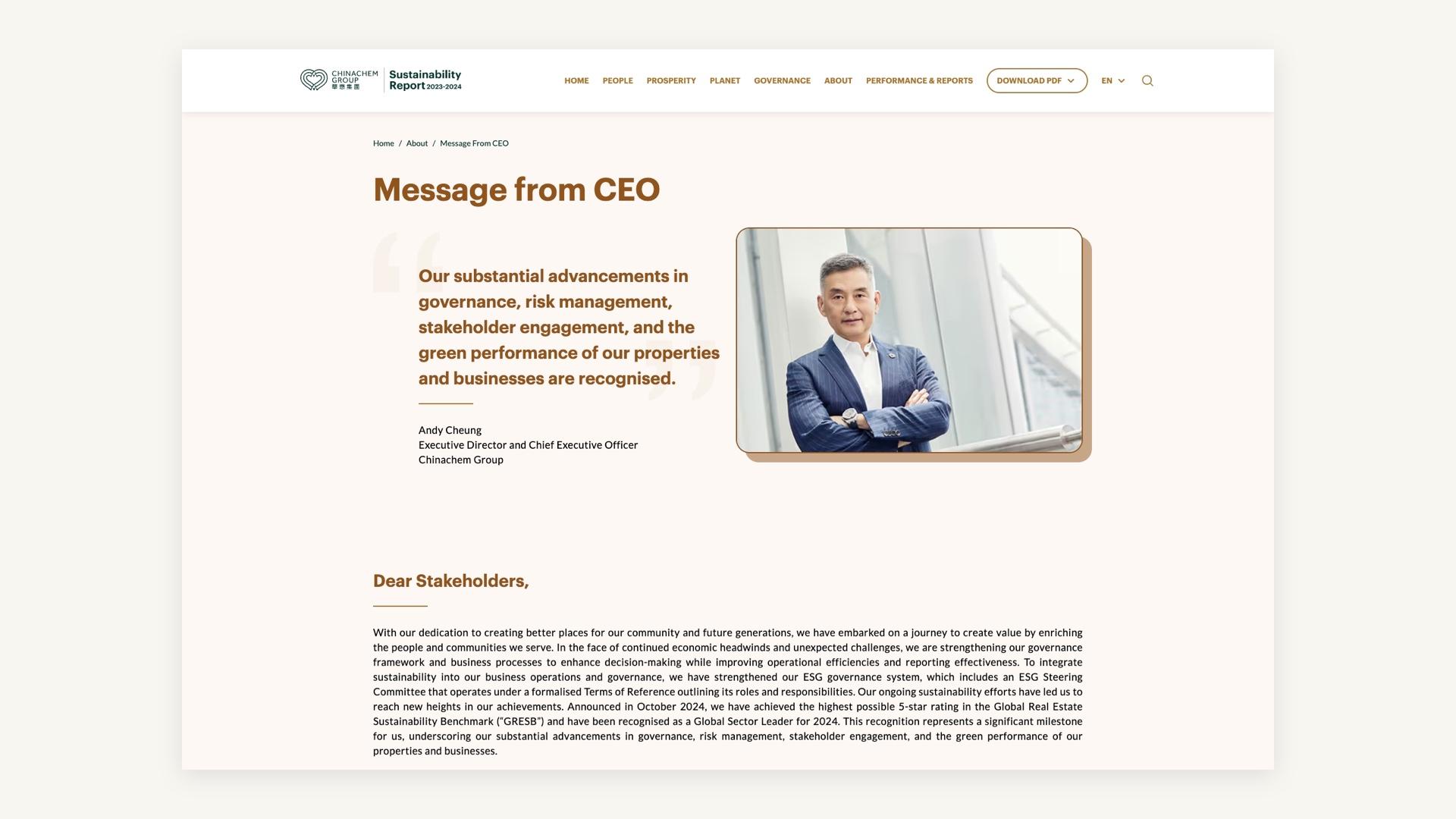 Chinachem Group (CCG) presents its Sustainability Report 2023-2024, highlighting its unwavering dedication to corporate social responsibility and efforts toward substantial advancements in corporate governance, risk management, stakeholder engagement, and the green transformation of its properties and businesses. This underscores CCG’s role in pioneering sustainable practices within its industry and its vision for a resilient future.