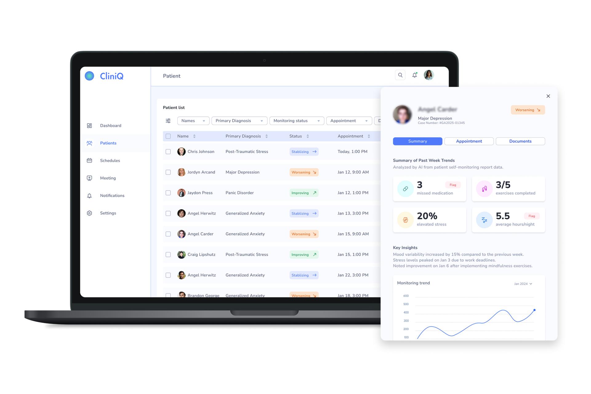 By eliminating cognitive overload and streamlining workflow, CliniQ empowers clinicians to offer more sessions, provide better care, and deliver compassionate, patient-centered mental health support.