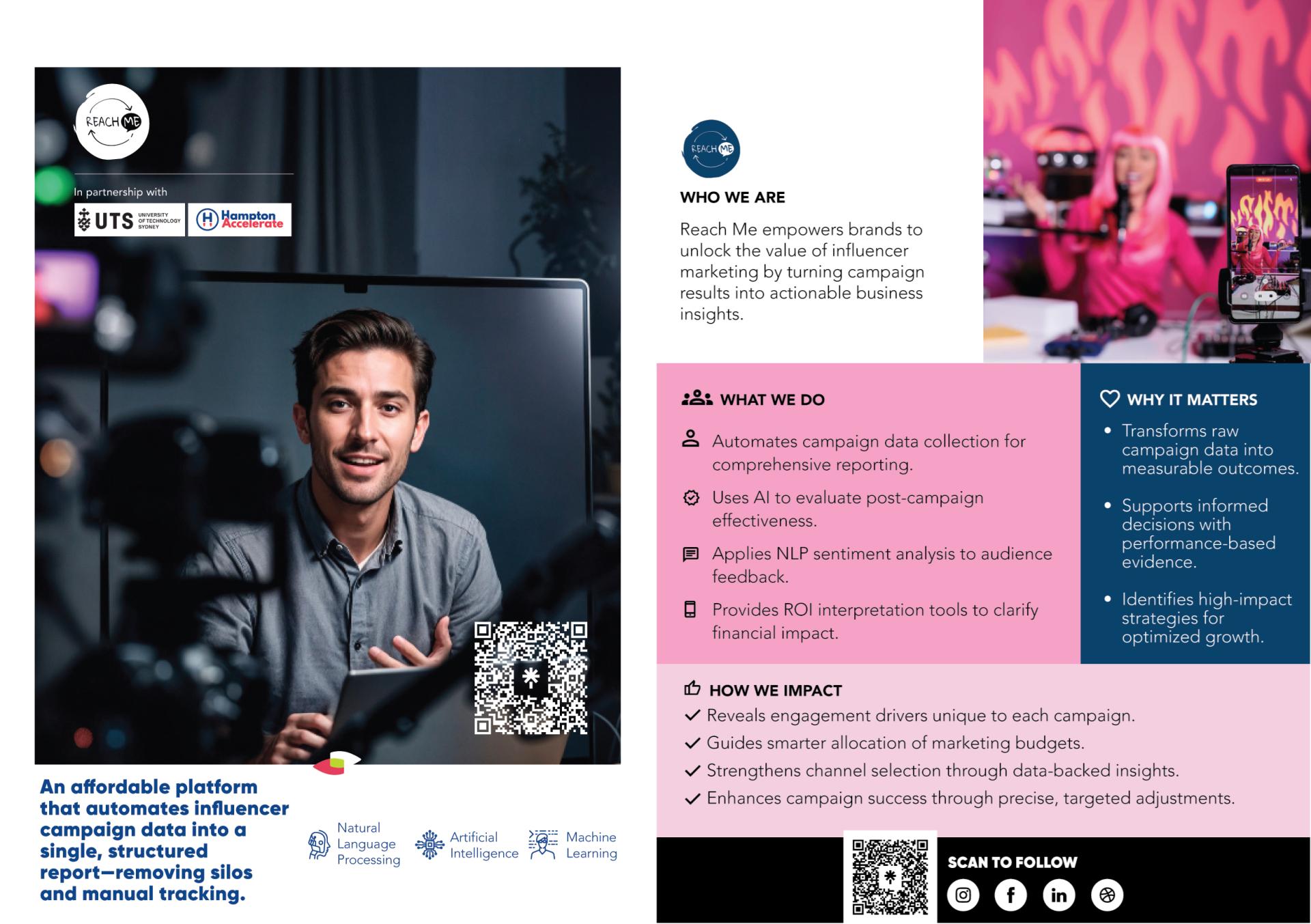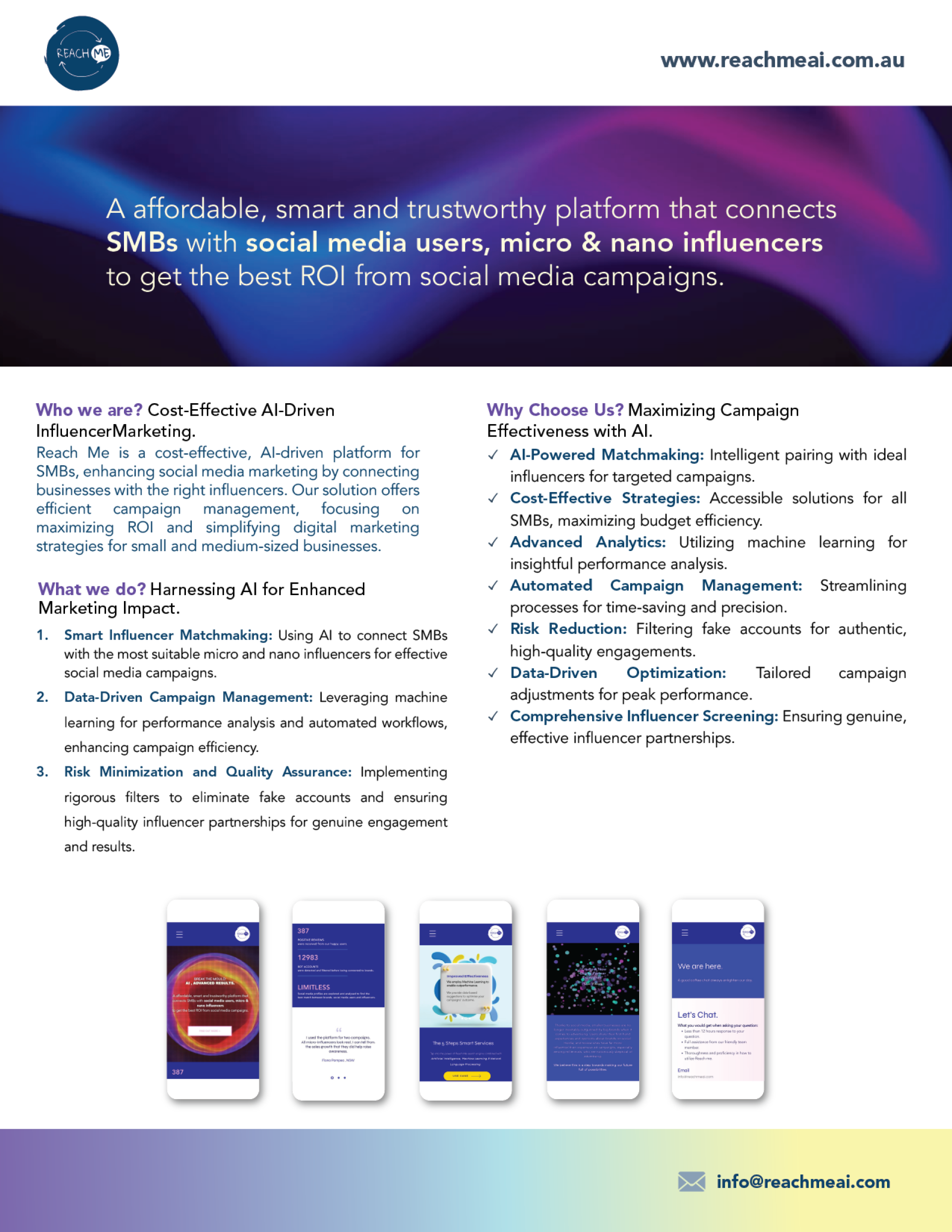 Reach Me also detects fraud, flags compliance risks, and standardises campaign reporting, bringing transparency and trust to an industry plagued by inconsistent metrics and hidden practices. By combining cutting-edge AI, ethical safeguards, and accessibility, Reach Me empowers time-poor SMEs and emerging creators to compete with big-budget teams. It levels the playing field—turning marketing from a costly, complex challenge into a clear, data-driven path to growth. Backed by collaborations with Kitly, 4mation, and the Australian AI Institute at UTS, Reach Me is redefining what’s possible in AI-driven digital marketing—making it smarter, fairer, and accessible to all.