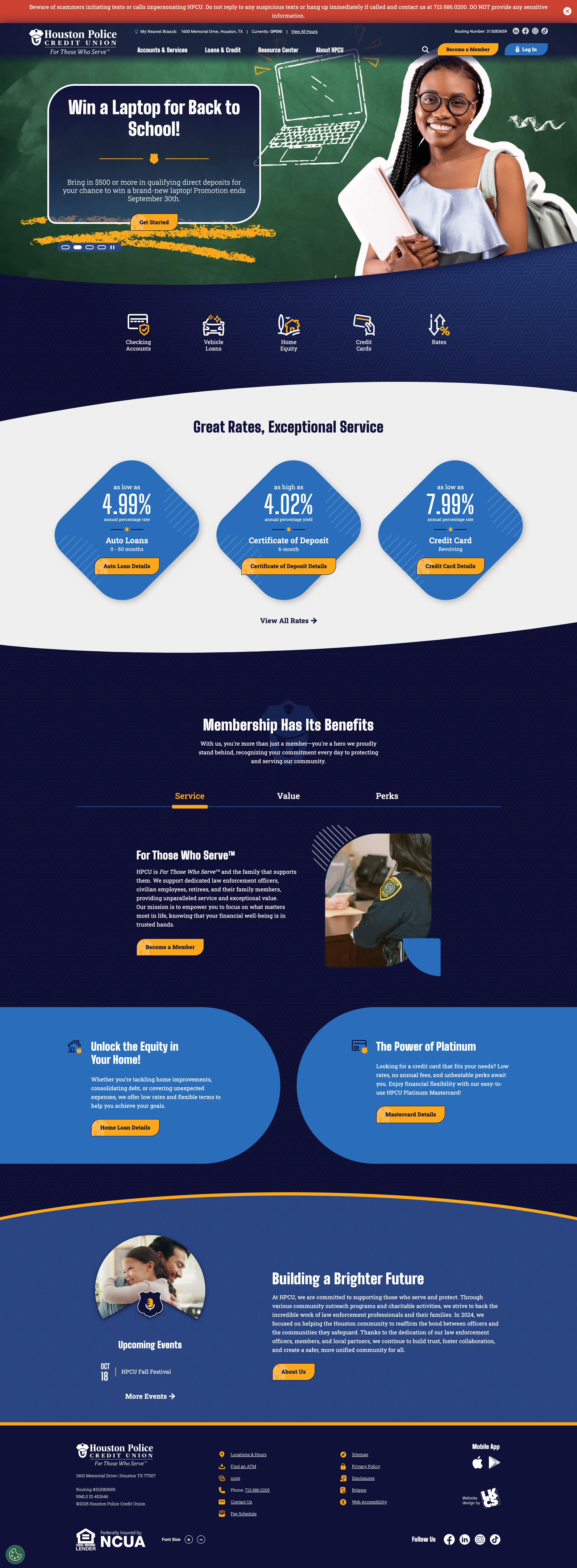 We worked with Houston Police Credit Union (HPCU) to create a website that’s not only functional and secure but also welcoming and easy to navigate. HPCU has a long-standing commitment to serve Houston’s law enforcement community, and the goal was to create a digital experience that reflects that dedication while meeting the needs of a modern banking audience. The redesigned site features a clean, professional layout enhanced by a calm blue and gray color scheme — chosen to convey trust, stability, and approachability. The navigation structure was reimagined to streamline access to essential services like online banking, loans, rates, and member resources. Clear calls-to-action and simplified page layouts help guide users efficiently without feeling overwhelming. Responsive design was a top priority, ensuring that members can manage their accounts smoothly from any device. We incorporated thoughtful design touches like subtle hover effects, easy-to-read typography, and community imagery to bring warmth and personality to the interface, while staying aligned with HPCU’s brand identity. The result is a website that blends user-friendly design with the operational reliability members expect. It not only supports HPCU’s mission but also strengthens member engagement and positions the credit union for continued digital growth.
