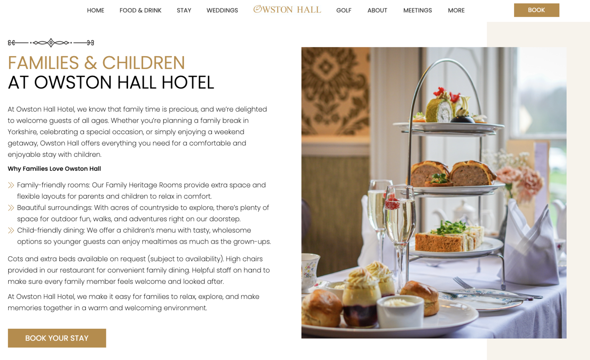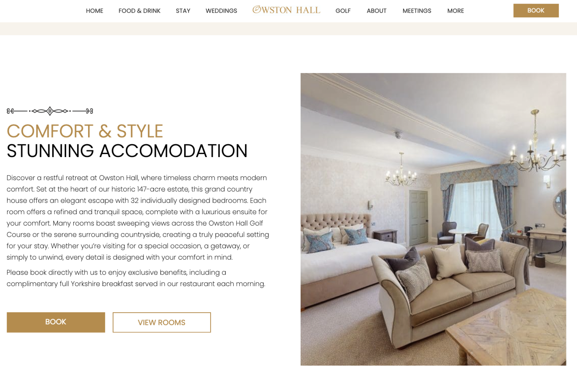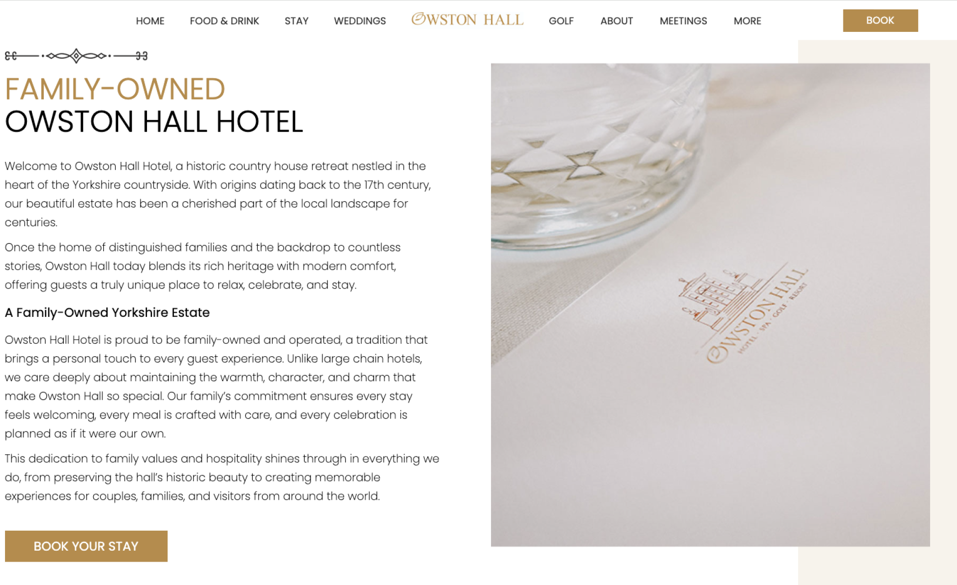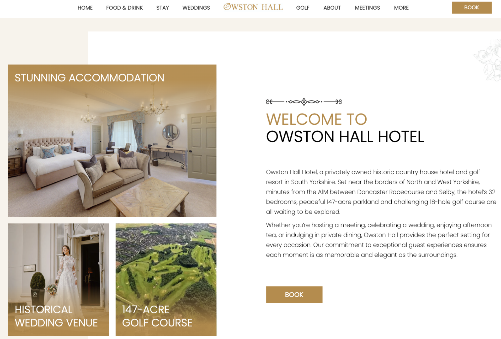 Owston Hall is a leading Yorkshire destination with a proud heritage, a thriving golf course and one of the region’s most sought after wedding venues. We required a new website that reflected the elegance and character of our estate while delivering a modern user experience that would convert inspiration into bookings. Our goals were to simplify navigation across key areas such as stay, dining, weddings and golf, ensure mobile responsiveness, and create a visual identity that would showcase our venue’s prestige. The site needed to strengthen engagement, drive reservations and present Owston Hall with clarity and distinction online.